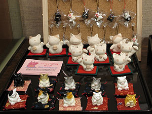 猫作家さん手作りのアクセサリー、マグカップ、写真集など、すべて猫をデザインした洒落た小物や雑貨たちが大集合した「猫の小さなおくりもの・かざりもの展」。ギャラリー猫町の落ち着いた空間とセンスあるディスプレーがよりいっそう猫さんたちを盛り上げ、ワクワクした雰囲気でした。 |